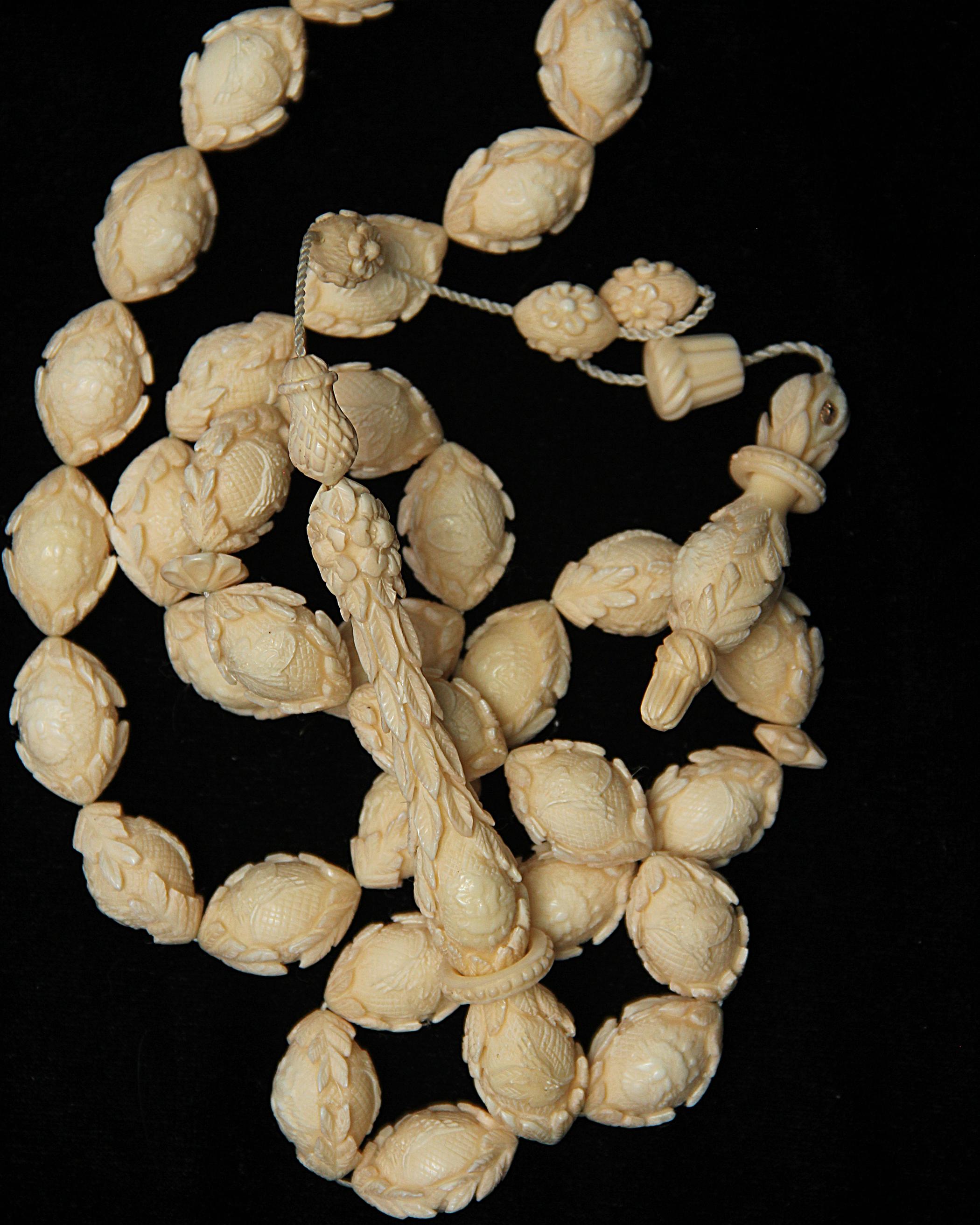 Sırasıyla her tanede bir padişahın tuğrası ve arkasında osmanlı arması işlemeli fildişi tespih